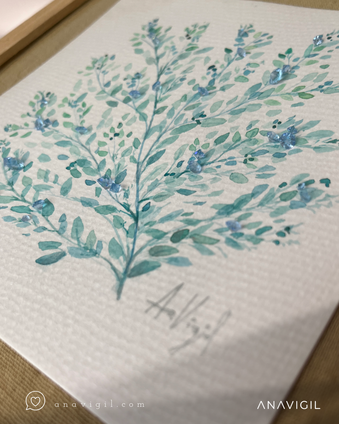 Esta obra pertenece a la serie «Cristálica«, en la cual se crea un vínculo entre lo orgánico y mineral a través de acuarelas intervenidas con cristales. La serie muestra cómo la acuarela y el cristal, con comportamientos opuestos, pueden convivir en una misma obra. Las obras se construyen desde la contención formal y el diálogo entre materiales de comportamiento opuesto: la acuarela, asociada a la fluidez y al tiempo, y el cristal, ligado a la permanencia y la estructura.